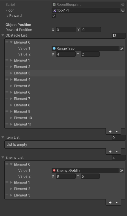 - roomBlueprint의 ObstacleList, ItemList, EnemyList에 정의된 콘텐츠를 순회