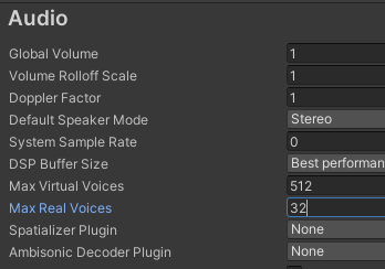 ProjectSettings에서 Audio에서 Max Real Voices 항목에서 개수를 조절하여 간단하게 사운드 중첩 오류를 해결하였다. 실제 음성 제한 개수에 들어오면 Priority로 우선순위가 지정되고 나머지 사운드는 가상 사운드로 변경된다.