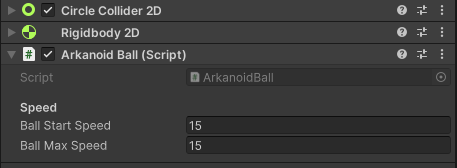 - 움직일 공의 필수 컴포넌트 2개인 Rigidbody2D와 CircleCollider2D를 추가